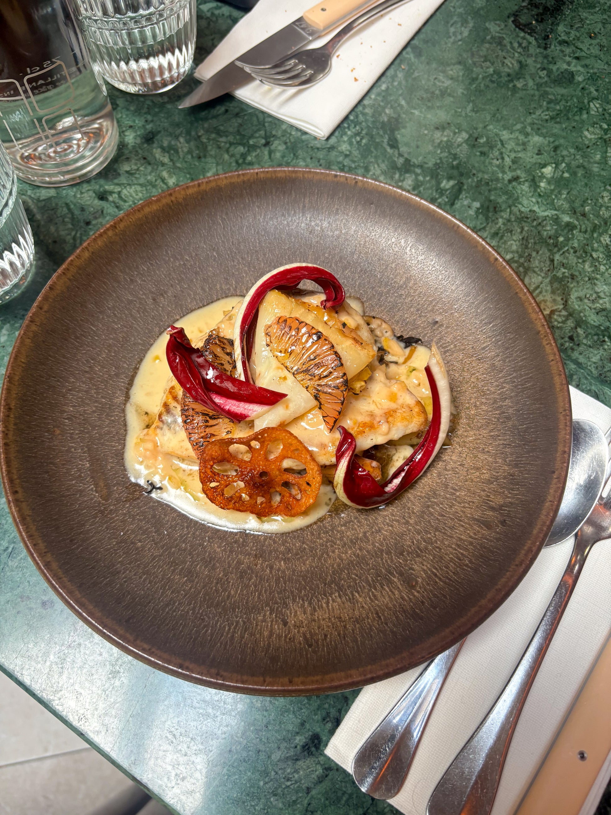 Légumes racines rôties tubéreux ,voile de Pamplemousse de Floride, sauce au beurre avec caviar