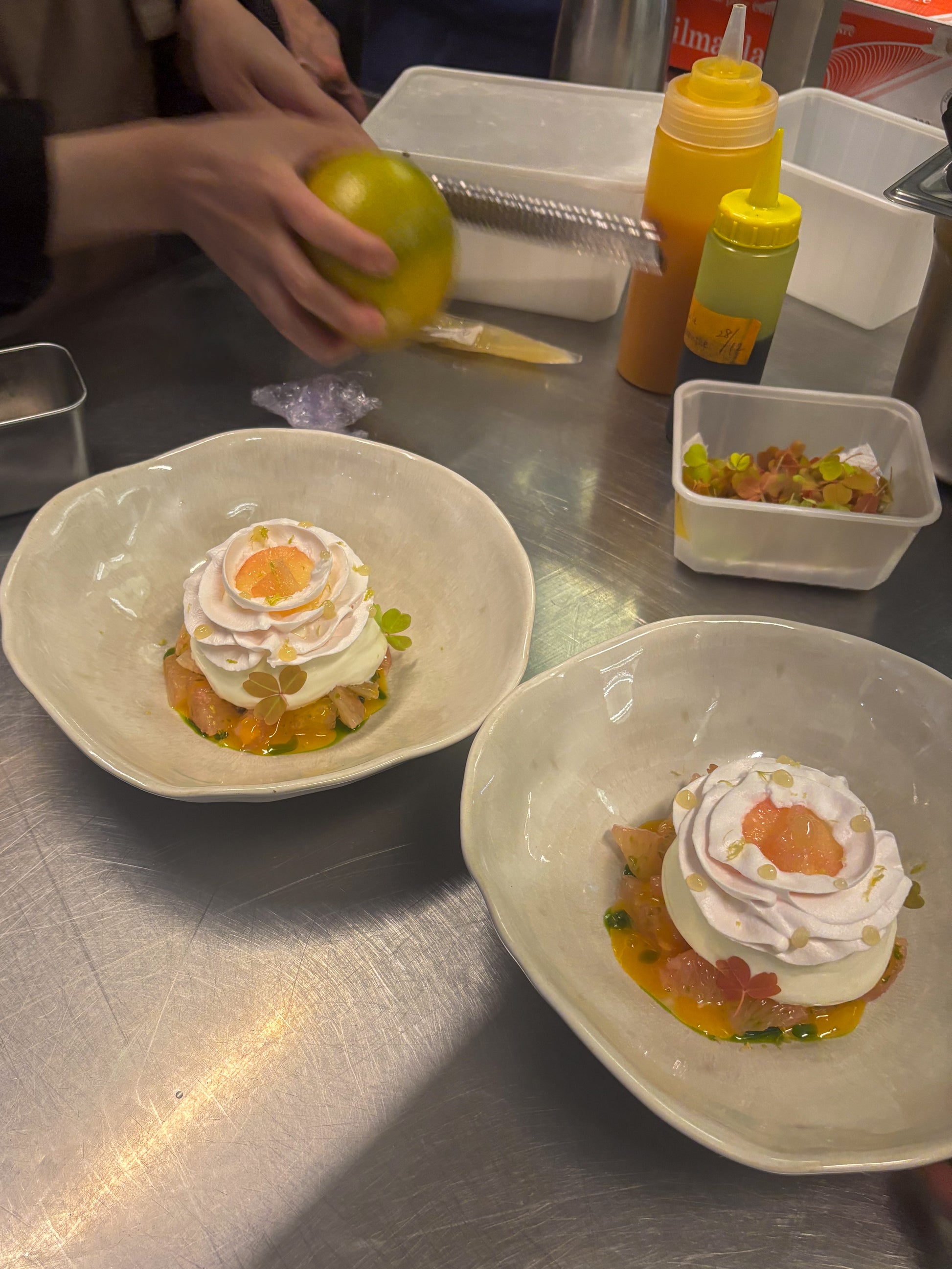 Vacherin au Pamplemousse de Floride, siphon de fromage blanc, glace à l'oseille, crumble et suprême de Pamplemousse de Floride
